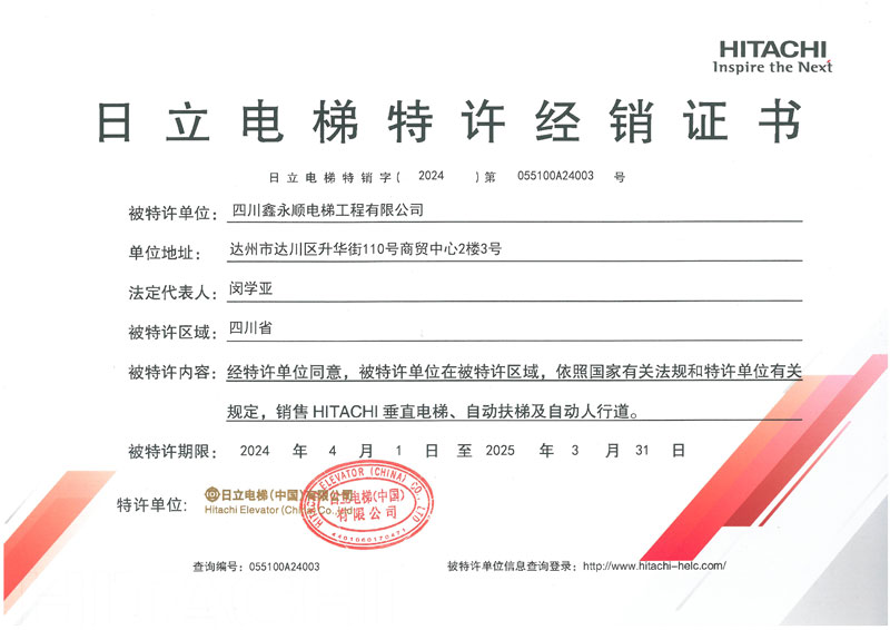 日立電梯特許經銷證書